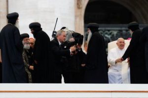 Pope Francis and Pope Tawadros II, the 118th Pope of the Coptic Orthodox Church of Alexandria and Patriarch of the See of St. Mark Cathedral, greet people at the end of the weekly general audience in St. Peter’s Square at the Vatican, May 10, 2023. REUTERS/Remo Casilli