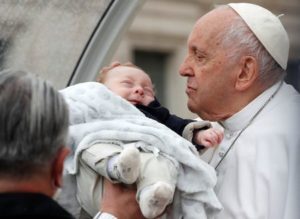 Pope Francis holds a child after the weekly general audience in St. Peter’s Square at the Vatican, May 10, 2023. REUTERS/Remo Casilli