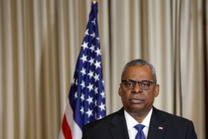 FILE PHOTO-U.S. Secretary of Defense Lloyd Austin speaks during a news conference with U.S. Chairman of the Joint Chiefs of Staff General Mark A. Milley (not pictured) on the day of the fourth Ukraine Contact Group meeting at Ramstein U.S. Air Base, Germany, April 21, 2023. REUTERS/Heiko Becker