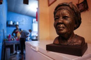 A sculpture to honour the work of Ouma Katrina Esau, the last known fluent mother-tongue speaker of the indigenous N|uu language, is seen at their house in Upington, in the Northern Cape province, South Africa, April 18, 2023. REUTERS/Esa Alexander