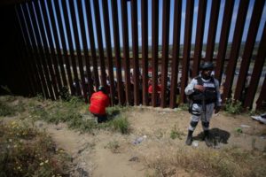 FILE PHOTO: A member of the National Guard keeps watch as a food delivery employee takes orders from migrants standing between the primary and secondary fences, as the United States prepares to lift COVID-19 era restrictions known as Title 42, that have blocked migrants at the U.S.- Mexico border from seeking asylum since 2020, as seen from Tijuana, Mexico May 10, 2023. REUTERS/Jorge Duenes/File Photo