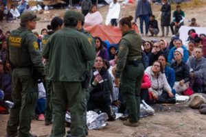 A migrant shows U.S. border patrol her passport as migrants continue to gather between primary and secondary border fences as the United States prepares to lift COVID-19 era Title 42 restrictions that have blocked migrants at the U.S.-Mexico border from seeking asylum since 2020, near San Diego, California, U.S., May 11, 2023. REUTERS/Mike Blake