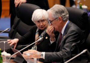 US Secretary of the Treasury Janet Yellen talks with Chair of the Board of Governors of the US Federal Reserve System Jerome Powell before the start of the G7 Finance Ministers and Central Bank Governors’ Meeting opening session at International Conference Room of Toki Messe in Niigata, northern Japan, 11 May 2023. KIMIMASA MAYAMA/Pool via REUTERS