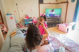 Bianca Haynes wipes her six-year-old daughter Afena’s mouth while breastfeeding her newborn daughter Zuri in Elmwood Park, New Jersey, U.S., May 30, 2022. REUTERS/Joy Malone
