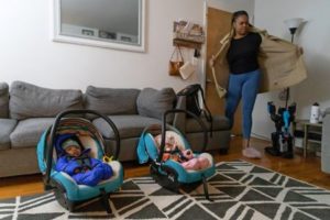 Chelsea Ward, 32, takes her coat off after picking up her seven-month-old twins, Callie Rae Polen and Cai Ryan Polen, from daycare in Fords, New Jersey, U.S., January 13, 2023. REUTERS/Joy Malone