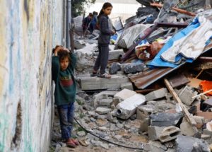 A children stand next to rubble, in the aftermath of deadly Israeli strikes, in the northern Gaza Strip May 12, 2023. REUTERS/Mohammed Salem