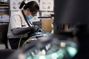 FILE PHOTO: A factory worker works on a machined aircraft part at Abipa Canada in Boisbriand, Quebec, Canada May 10, 2023. REUTERS/Evan Buhler/File Photo