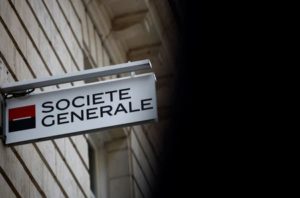 FILE PHOTO: The logo of Societe Generale bank is pictured on an office building in Nantes, France, March 16, 2023. REUTERS/Stephane Mahe