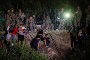 Asylum seekers walk along the banks of the Rio Bravo river after crossing the border to turn themselves in to U.S. Border Patrol agents while Title 42 is lifted, in Matamoros, Mexico, May 11, 2023. REUTERS/Daniel Becerril
