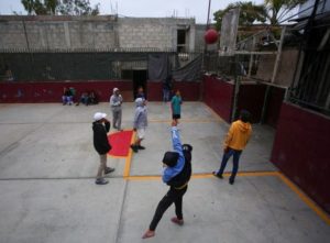 Migrants children play with a basketball as migrants from different countries who applied for an asylum appointment in the United States, using the CBP ONE application, wait to be notified by US Immigration officials, at Agape Mision Mundial INC shelter, on the US border, in Tijuana, Mexico May 12, 2023. REUTERS/Jorge Duenes