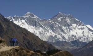 FILE PHOTO: A tourist looks at a view of Mt. Everest from the hills of Syangboche in Nepal December 3, 2009. REUTERS/Gopal Chitrakar