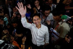 Move Forward Party leader and prime ministerial candidate, Pita Limjaroenrat, waves to the crowd during the general election in Bangkok, Thailand, May 14, 2023. REUTERS/Jorge Silva