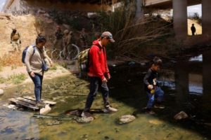 Migrants seeking asylum cross the Rio Bravo river to return to Mexico from the United States, after members of the Texas Army National Guard extend razor wire to inhibit migrants crossing, as seen from Ciudad Juarez, Mexico May 13, 2023. REUTERS/Jose Luis Gonzalez