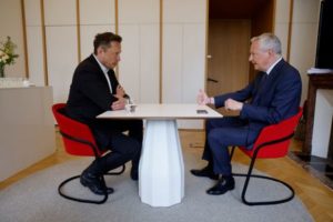 Electric car maker Tesla CEO Elon Musk meets with French Minister for the Economy and Finances Bruno Le Maire on the sidelines of the 6th edition of the “Choose France” Summit at the Chateau de Versailles, outside Paris on May 15, 2023. LUDOVIC MARIN/Pool via REUTERS