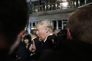 Republican U.S. presidential candidate Donald Trump (R) speaks to reporters while touring the construction site of the Trump International Hotel at the Old Post Office Building, following a news conference in Washington March 21, 2016. REUTERS/Jim Bourg/File Photo