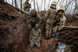 Ukrainian soldiers stay next to a captured Russian army serviceman, according to them, on positions recently gained in an offensive, as Russia’s attack on Ukraine continues, near the front line city of Bakhmut, in Donetsk region, Ukraine May 11, 2023. Radio Free Europe/Radio Liberty/Serhii Nuzhnenko via REUTERS