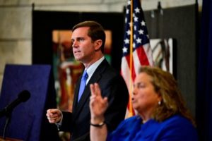 Kentucky’s Democratic Governor Andy Beshear speaks during a memorial service for those who died from the coronavirus disease (COVID-19), held on the Capitol grounds in Frankfort, Kentucky, U.S., November 14, 2021. REUTERS/Jon Cherry/File Photo