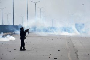 A police officer fires a tear gas shell during clashes with the supporters of Pakistan’s former Prime Minister Imran Khan in Islamabad, Pakistan, May 12, 2023. REUTERS/Stringer