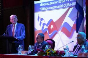 Boris Titov, head of the Russian delegation of the Cuban-Russian Business Committee gives a speech in Havana, Cuba, May 17, 2023. REUTERS/Alexandre Meneghini