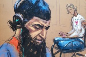 Marion Van Reeth of Belgium glares at Sayfullo Saipov, who was convicted in January of murder and terrorism charges after mowing down cyclists and pedestrians with a truck, as she is wheeled out after giving her victim impact statement at a sentencing hearing in New York, U.S., May 17, 2023 in this courtroom sketch. REUTERS/Jane Rosenberg