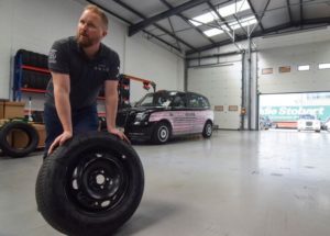 Gunnlaugur “G” Erlendsson, CEO of UK-based tyre startup Enso, stands with a tyre the company has developed specifically for electric vehicles, at a taxi service hub, in London, Britain May 10, 2023. REUTERS/Nick Carey