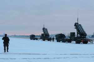 FILE PHOTO: Serviceman patrols in front of the Patriot air defence system during Polish military training on the missile systems at the airport in Warsaw, Poland February 7, 2023. REUTERS/Kacper Pempel