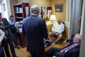 U.S. Senators John Fetterman (D-PA), Peter Welch (D-VT), and Edward Markey (D-MA) chat before a press conference on Capitol Hill about 11 Senate Democrats who sent a letter to President Joe Biden urging him to invoke the 14th Amendment to avoid a catastrophic debt default, in Washington, U.S., May 18, 2023. REUTERS/Evelyn Hockstein