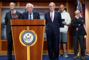U.S. Senator Bernie Sanders, joined by Senators Jeff Merkley (D-OR), Edward Markey (D-MA), John Fetterman (D-PA), and Peter Welch (D-VT), speaks at a press conference on Capitol Hill about 11 Senate Democrats who sent a letter to President Joe Biden urging him to invoke the 14th Amendment to avoid a catastrophic debt default, in Washington, U.S., May 18, 2023. REUTERS/Evelyn Hockstein