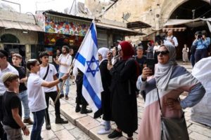 Israelis and Palestinians stand opposite to each other near Damascus gate to Jerusalem’s Old city as Israel mark Jerusalem Day, in Jerusalem May 18, 2023. REUTERS/Ronen Zvulun
