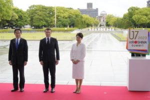 French President Emmanuel Macron poses for a photo with Japan’s Prime Minister Fumio Kishida and his wife Yuko Kishida at the Peace Memorial Park during a visit as part of the G7 Hiroshima Summit in Hiroshima, Japan, 19 May 2023. The G7 Hiroshima Summit will be held from 19 to 21 May 2023. FRANCK ROBICHON/Pool via REUTERS
