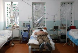 A wounded Ukrainian soldier lies in the emergency room of an emergency treatment point near the frontline, amid Russia’s attack on Ukraine, in Zaporizhzhia region, Ukraine, May 17, 2023. REUTERS/Bernadett Szabo