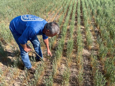 FILE PHOTO: Gary Millershaski, a farmer and scout on the Wheat Quality Council's Kansas wheat tour, inspects winter wheat stunted by drought near Syracuse