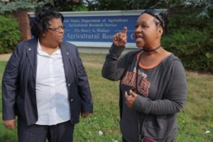 Claudette Joyner, president of the American Federation of Government Employees (AFGE) Local 3147 and a realty specialist at the U.S. Department of Agriculture’s (USDA) Beltsville Agricultural Research Center (BARC) and Ashaki “Teddi” Mitchell, vice-president of AFGE Local 3147 and a biological science laboratory technician at the same facility, talk to a reporter about an employee whistleblower complaint alleging unsafe work conditions for employees at the center as they stand in front of the farm research facility in Beltsville, Maryland, U.S. May 17, 2023. REUTERS/Jim Bourg