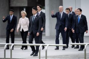 Britain’s Prime Minister Rishi Sunak, European Commission’s President Ursula von der Leyen, Canada’s Prime Minister Justin Trudeau, US President Joe Biden, France’s President Emmanuel Macron, European Council’s President Charles Michel, Germany’s Chancellor Olaf Scholz and Japan’s Prime Minister Fumio Kishida visit the Peace Memorial Park as part of the G7 Leaders’ Summit in Hiroshima on May 19, 2023. BRENDAN SMIALOWSKI/Pool via REUTERS