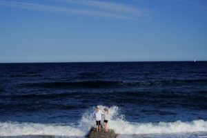 Children of tourists joke in front of the Mediterranean Sea at the Barceloneta beach in Barcelona, Spain, April 8, 2023. REUTERS/Nacho Doce