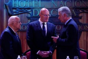 Cuba’s President Miguel Diaz-Canel, Cuba’s Foreign Trade and Investment Minister Ricardo Cabrisas and Deputy Prime Minister of the Russian Federation Dmitry Chernyshenko chat during a forum of Russian entrepreneurs in Havana, Cuba, May 19, 2023. REUTERS/Alexandre Meneghini