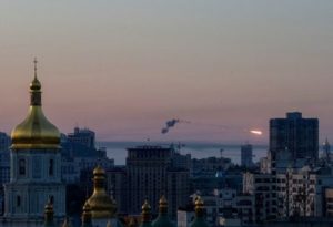 An explosion of a missile is seen in the sky over the city during a Russian missile strike, amid Russia’s attack on Ukraine, in Kyiv, Ukraine May 18, 2023. REUTERS/Stringer