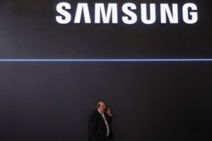 FILE PHOTO: A man uses a phone below a Samsung sign, during the GSMA’s 2023 Mobile World Congress (MWC) in Barcelona, Spain March 1, 2023. REUTERS/Nacho Doce