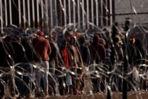 FILE PHOTO: Migrants stand near the border wall after having crossed the U.S.-Mexico border to turn themselves in to U.S. Border Patrol agents, after the lifting of COVID-19 era Title 42 restrictions that have blocked migrants at the border from seeking asylum since 2020, as seen from Ciudad Juarez, Mexico May 12, 2023. REUTERS/Jose Luis Gonzalez