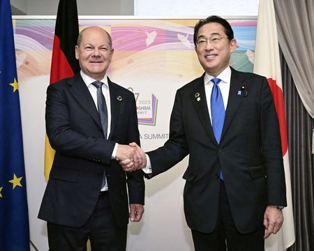 FILE PHOTO: German Chancellor Olaf Scholz holds a bilateral meeting with Japan's Prime Minister Fumio Kishida on the sideline of the G7 leaders' summit in Hiroshima
