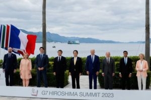 President of the European Council Charles Michel, Italy’s Prime Minister Giorgia Meloni, Canada’s Prime Minister Justin Trudeau, France’s President Emmanuel Macron, Japan’s Prime Minister Fumio Kishida, U.S. President Joe Biden, Germany’s Chancellor Olaf Scholz, Britain’s Prime Minister Rishi Sunak and European Commission President Ursula von der Leyen participate in a family photo with G7 leaders before their working lunch meeting on economic security during the G7 summit, at the Grand Prince Hotel in Hiroshima, Japan, May 20, 2023. REUTERS/Jonathan Ernst/Pool