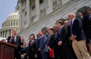 FILE PHOTO: U.S Speaker of the House Kevin McCarthy (R-CA) speaks to reporters as he stands with Congressional Republicans from both the U.S. House and Senate during an event addressing debt ceiling negotiations with President Joe Biden outside the U.S. Capitol in Washington, U.S., May 17, 2023. REUTERS/Nathan Howard