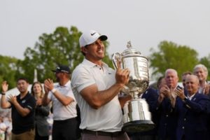 May 21, 2023; Rochester, New York, USA; Brooks Koepka celebrates after winning the PGA Championship golf tournament at Oak Hill Country Club. Mandatory Credit: Adam Cairns-USA TODAY Sports
