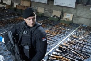 A police officer stands guard in front of the weapons handed over to police in the first ten days of gun amnesty in police storage following mass shootings in the country, near Smederevo, Serbia, May 14, 2023. REUTERS/Marko Djurica