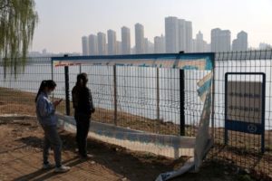 FILE PHOTO: Women wearing face masks following the coronavirus disease (COVID-19) outbreak stand near a fence by a river separating Beijing and Yanjiao in the neighbouring Hebei province, in Beijing, China April 20, 2022. Picture taken April 20, 2022. REUTERS/Tingshu Wang/File Photo