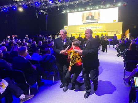 LONDON (Reuters) – Shell shareholders overwhelmingly supported the energy giant’s strategy at a raucous annual general meeting disrupted by climate activists who tried to storm the stage.