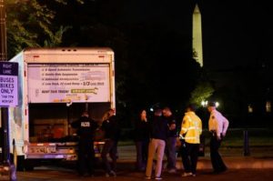 The U.S. Secret Service and other law enforcement agencies investigate a rented box truck that crashed into security barriers at Lafayette Park across from the White House in Washington, U.S. May 23, 2023. REUTERS/Nathan Howard