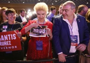 FILE PHOTO: Republican political operative Lev Parnas, wearing a “Special Guest” credential, stands next to a DeSantis supporter claiming to be Republican gubernatorial candidate Ron DeSantis’ first-grade teacher as she points him out in a class photo during DeSantis’ midterm election night victory party in Orlando, Florida, U.S. November 6, 2018. REUTERS/Carlo Allegri/File Photo
