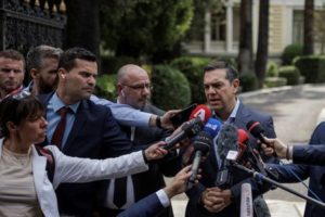 Leftist Syriza party leader Alexis Tsipras speaks to journalists outside the Presidential Palace, after a meeting with Greek President Katerina Sakellaropoulou, where he received an official mandate to try to form a coalition government after the general election in Athens, Greece, May 23, 2023. REUTERS/Alkis Konstantinidis