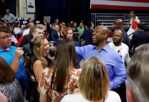 Supporters greet U.S. Senator Tim Scott (R-SC), the only Black Republican senator, as he announces his candidacy for the 2024 Republican presidential race in North Charleston, South Carolina, U.S. May 22, 2023. REUTERS/Randall Hill